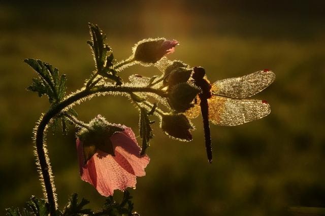 一只蜻蜓停留在花朵旁,它的翅羽泛着美丽的金光。