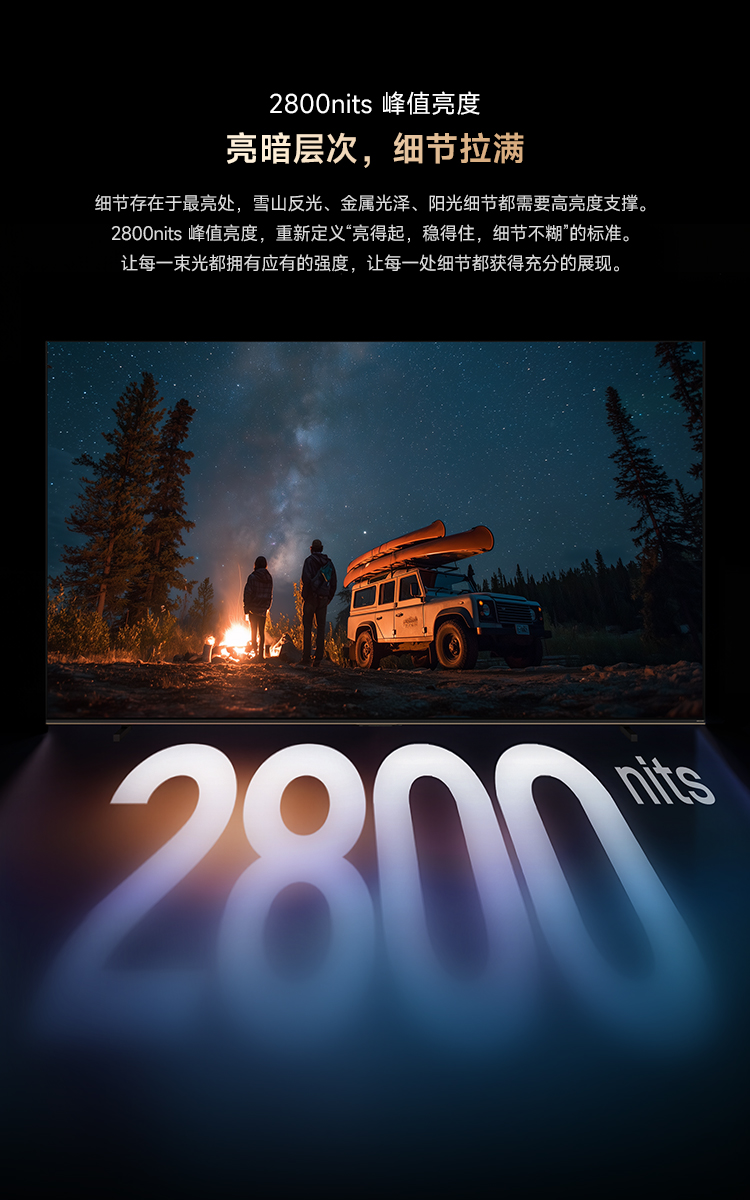基于千级独立背光分区的精细控光能力,V3000实现了2800尼特的惊人峰值亮度。这意味着什么?当你观看HDR视频时,画面里的阳光真的会刺眼,爆炸时的火光真的会让人下意识躲避 。而更难能可贵的是它的“黑”,在显示深邃的星空或黑暗的宇宙场景时,它能把亮度压到接近0.0005尼特,呈现出与OLED媲美的纯粹黑场,却完全没有烧屏的后顾之忧 。