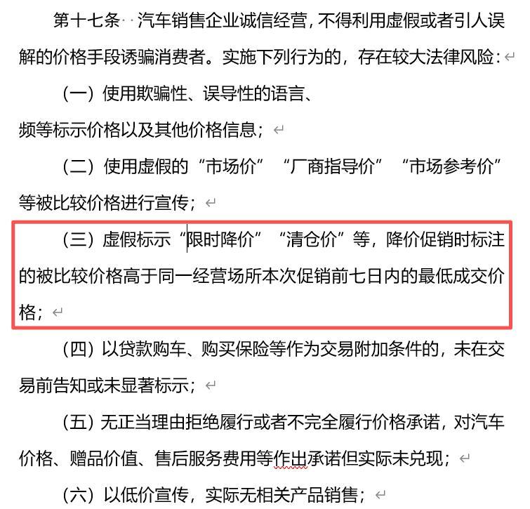 例如某车企明确限时降价至本月月底,但下个月还是这个价,甚至更便宜了!这种令人厌恶的促销方式将得到杜绝。