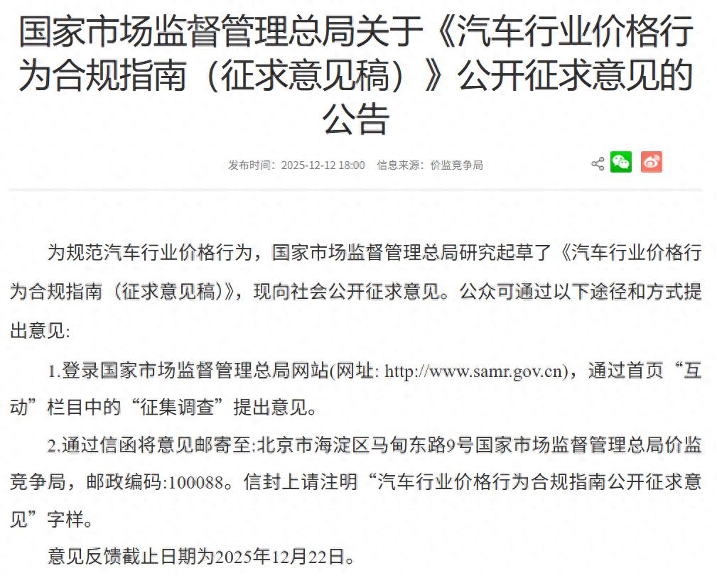 近期,国家市场监督管理总局发布《汽车行业价格行为合规指南(征求意见稿)》(以下简称《指南》),明确规定了车企除依法降价处理积压商品外,不得以其他方式使出厂价低于生产成本;