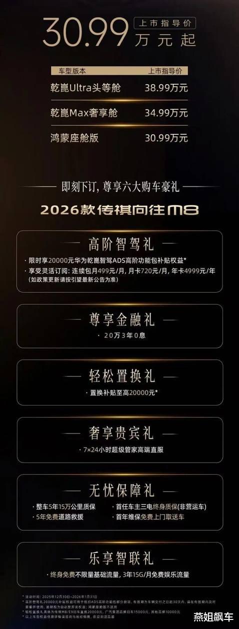 2025年12月30日,正值传祺M8上市八周年之际,2026款传祺向往M8感恩上市,新车上市指导价30.99万元起,限时补贴价仅28.99万元起。为回馈广大用户的长期信赖与支持,即日起下订即可尊享六大专属礼包:置换补贴至高20000元、限时享20000元华为乾崑智驾ADS高阶功能包补贴权益,以及20万3年0息金融礼等丰厚权益。