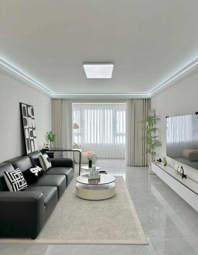 硬装没有做复杂吊顶,以及高级又昂贵的电视背景墙,能省则省是我硬装阶段唯一的诉求。全屋乳胶漆,800×800浅灰色地砖通铺,墙顶一圈做了石膏板的双眼皮,增加一些氛围感,省钱又好看。
