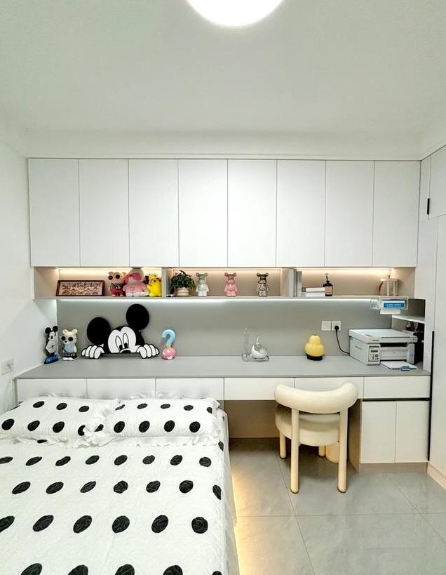 床头的位置和书桌连在一起,形成一张超长的书桌,既能摆放一些书籍和学习用品,还可以当作床头柜使用,增加卧室的整体功能性。小小的房间,也能拥有长长的书桌和多多的收纳柜。好好的规划一番,小房间也有大用处。