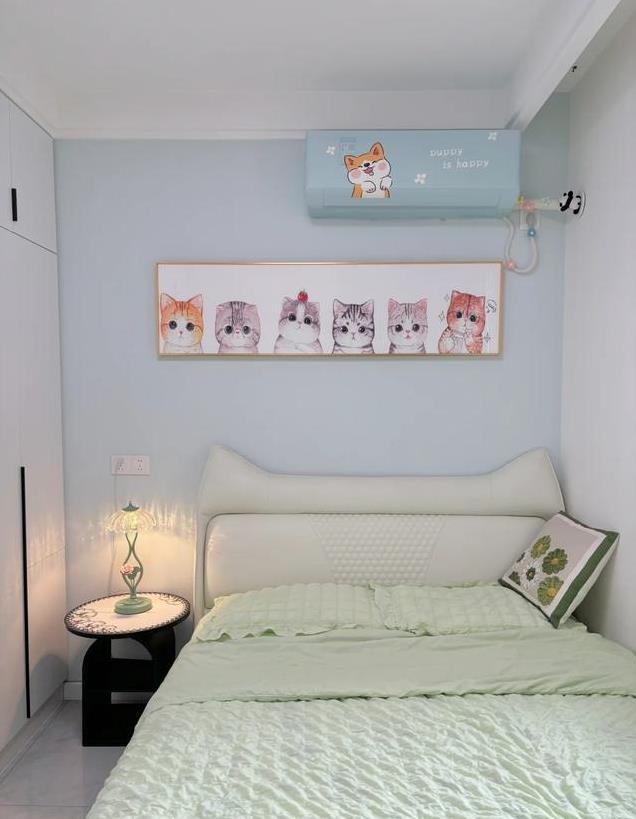这个房间的色彩要偏冷色一些,床头墙面刷了一个浅浅的蓝色,搭配上胖胖猫咪的装饰画,可可爱爱,又清爽舒适。