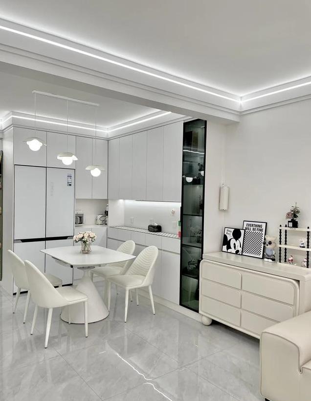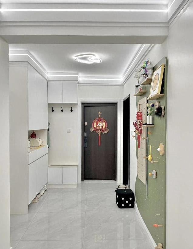 乳胶漆是菱花白的颜色,比纯白色要多一些的温馨度,颜色上又和白色比较接近,是现代简约风格墙面的不二选择,闭眼刷不翻车。