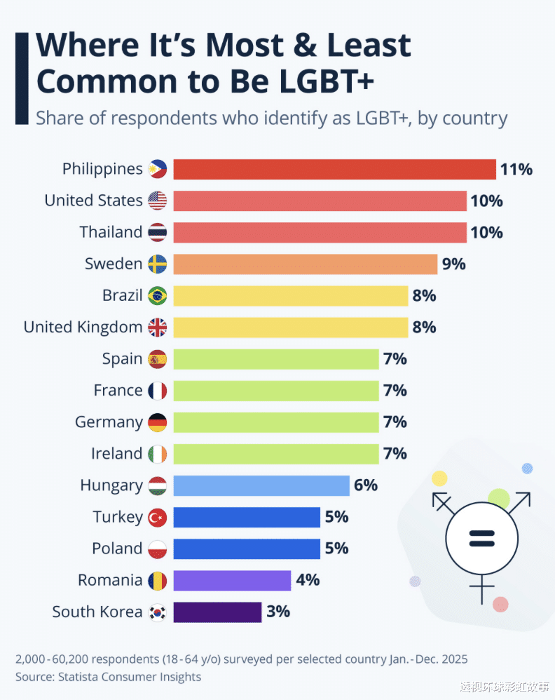 紧随其后的是美国和泰国,两国认同LGBTQ的成年人比例均为 10%,并列全球第二。美国作为多元文化融合的国家,社会可见度较高,而泰国则凭借对多元文化的包容氛围,以及 “彩虹经济” 的推动,让多元性取向获得了更宽松的生存空间,为经济发展也注入了独特动力。排名靠前的还有瑞典(9%)、巴西和英国(各 8%),这些国家多拥有较为开放的社会环境和完善的多元权益保障体系,为不同的性取向认同提供了良好的社会基础。