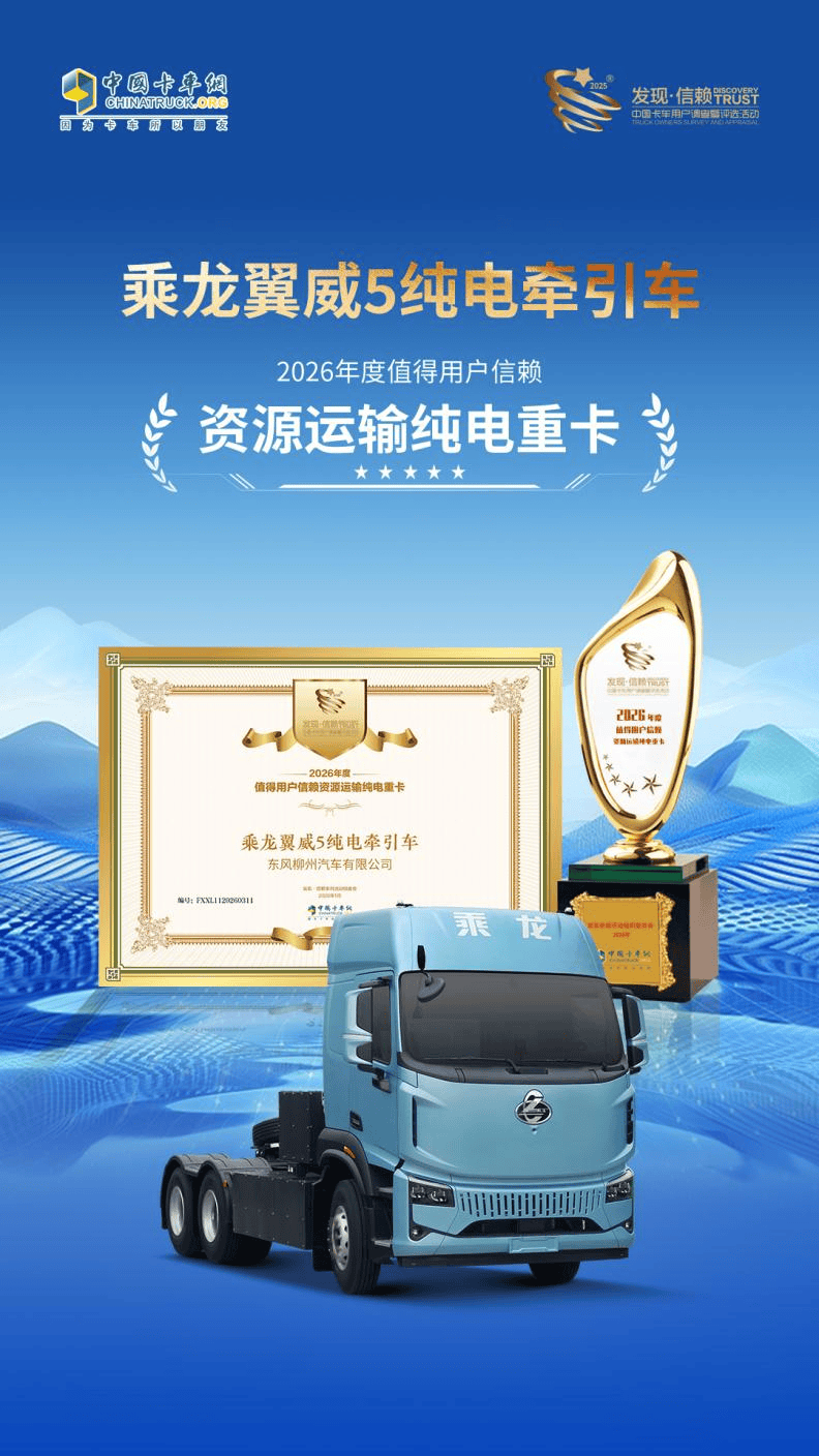 当“双碳”目标持续推动物流行业向零碳转型,资源运输领域对新能源重卡的需求愈发迫切——既要解决续航焦虑、承载不足的痛点,又要实现降本增效的运营目标。在此背景下,由中国卡车网主办的第十一届发现信赖中国卡车用户调查暨评选活动,以“用户评选+专家评审+数据验证”的三维标准,最终将“2026年度值得用户信赖 资源运输纯电重卡”奖项授予乘龙翼威5纯电牵引车。这款依托72年商用车制造积淀、全正向开发的新能源重卡,用“多拉、省电、高效、安全”的硬实力,为资源运输用户打造了可落地的创富解决方案。