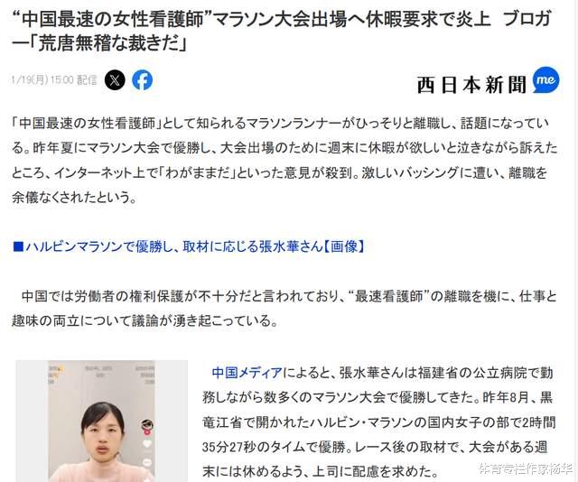 日本媒体《西日本新闻》近期关注“中国最快女护士”张水华离职风波,报道立场鲜明,字里行间透着对当事人的同情。报道围绕其护士与马拉松冠军的双重身份展开,将事件定性为个体追梦与现实挤压的典型案例。