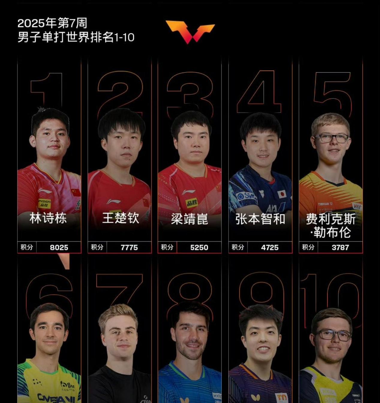 进入2025年初,海南冬训期间,王楚钦依然稳居世界男单第一,而林诗栋已经爬升至第二的位置。