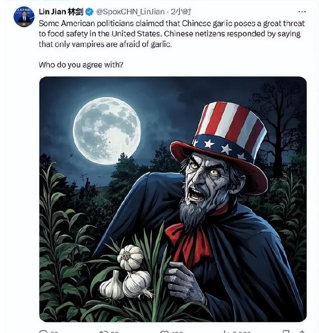 林剑的配文更是一针见血:“一些美国政客声称中国大蒜对美国食品安全构成巨大威胁,而中国网民认为,只有吸血鬼才害怕大蒜。”