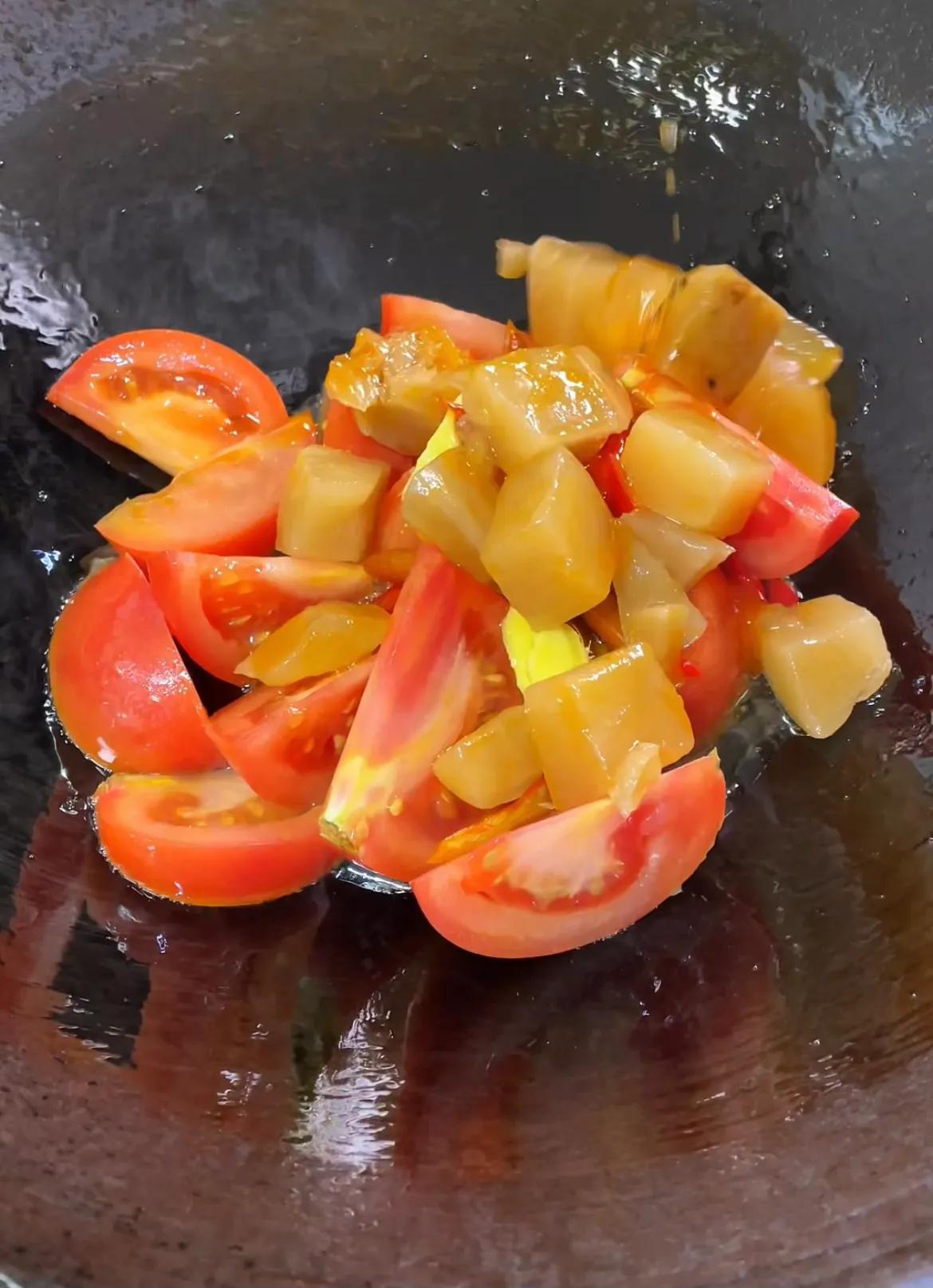 锅里油适量,倒入两个番茄,少许姜片跟泡椒。