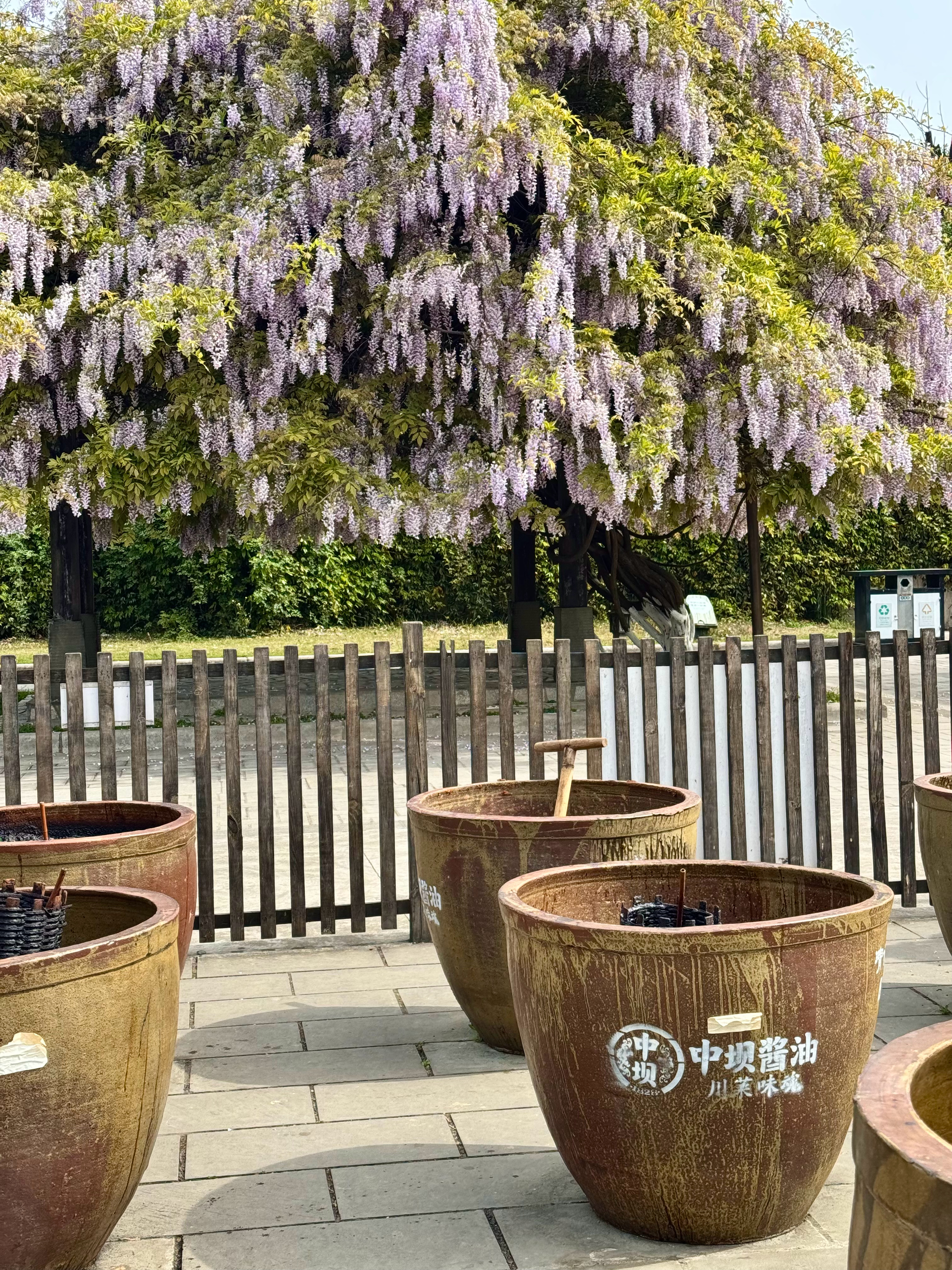 坐落在江油市的中国酱文化博览园,在这里不仅可以纵观中国重要酱料的发展史,还能亲自体验两百年的制酱工艺,看粮食一步一步变成我们餐桌上的酱油,最后也是最辛苦的一个步骤就是在180天的时间内,每日重复淋酱,待酱吸收日月之精华,才形成了这一道餐桌必不可少的鲜味来源。这紫藤花下的酱缸仿佛也吸饱了来自春日的灵气[好运连连]自媒体见证绵阳发展跟着吒儿游江油
