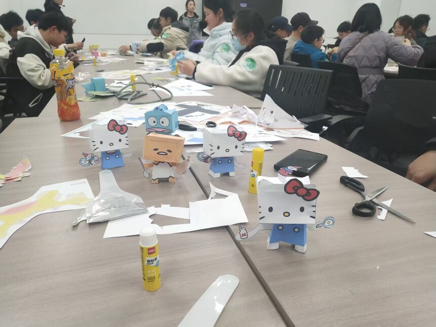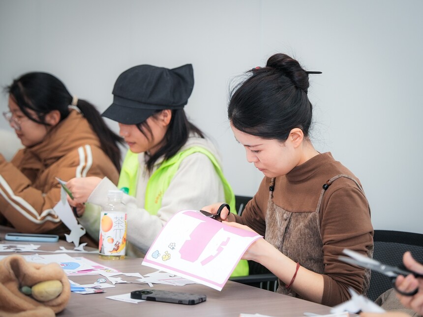 大学生们则尽显创意才华,根据每张折纸的简约线条,把折纸上的元素小心翼翼地剪下,创作了独具特色的作品。活动现场欢声笑语不断,大家在动手实践中放松了心情,也进一步加深了彼此之间的交流与互动。