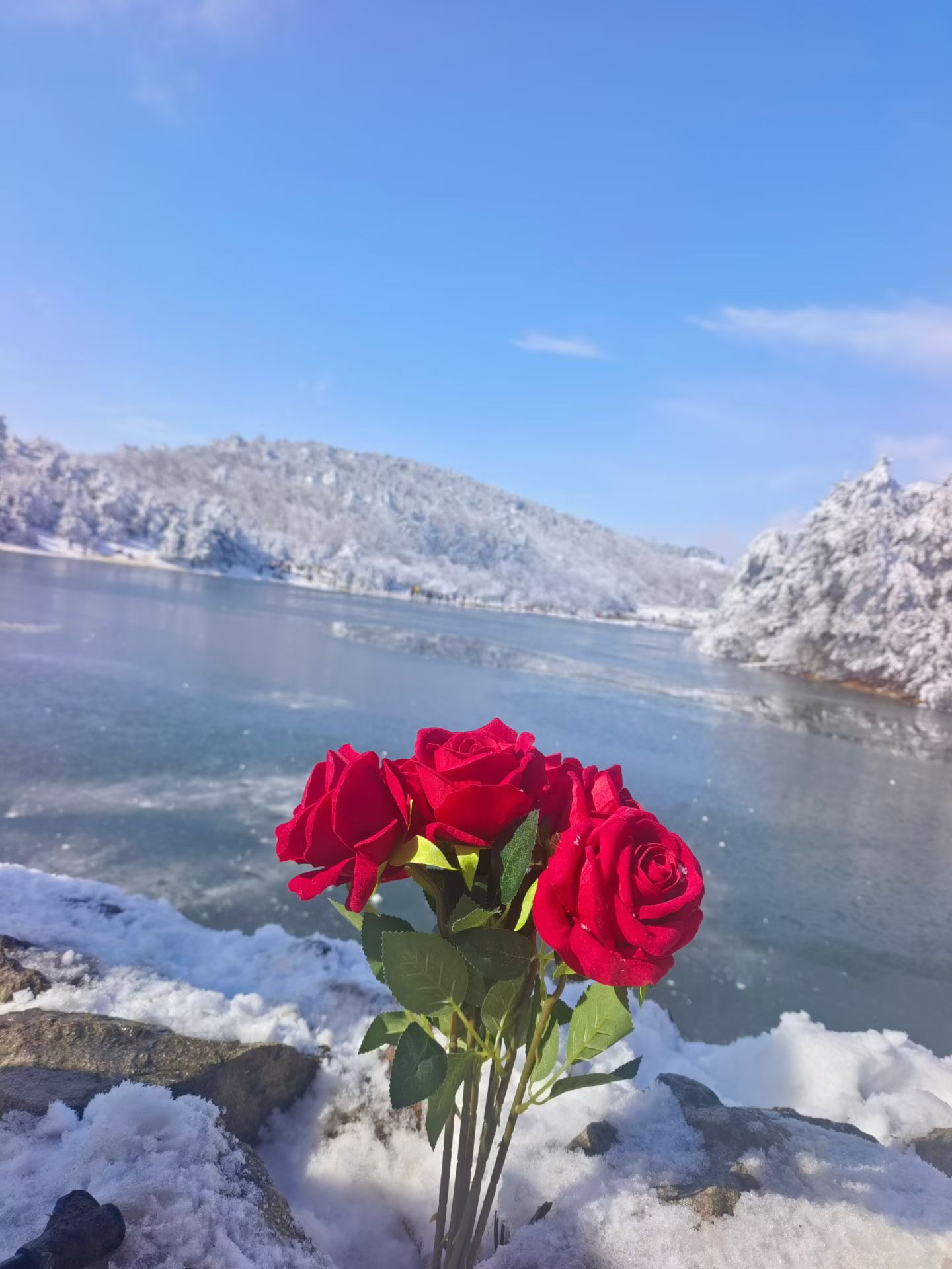山顶的小湖结冰后会呈现绝美的蒂芙尼蓝!光线好的时候宛如一颗巨大的宝石嵌在大地上~和雾凇云海一起构成冬日最美画面!