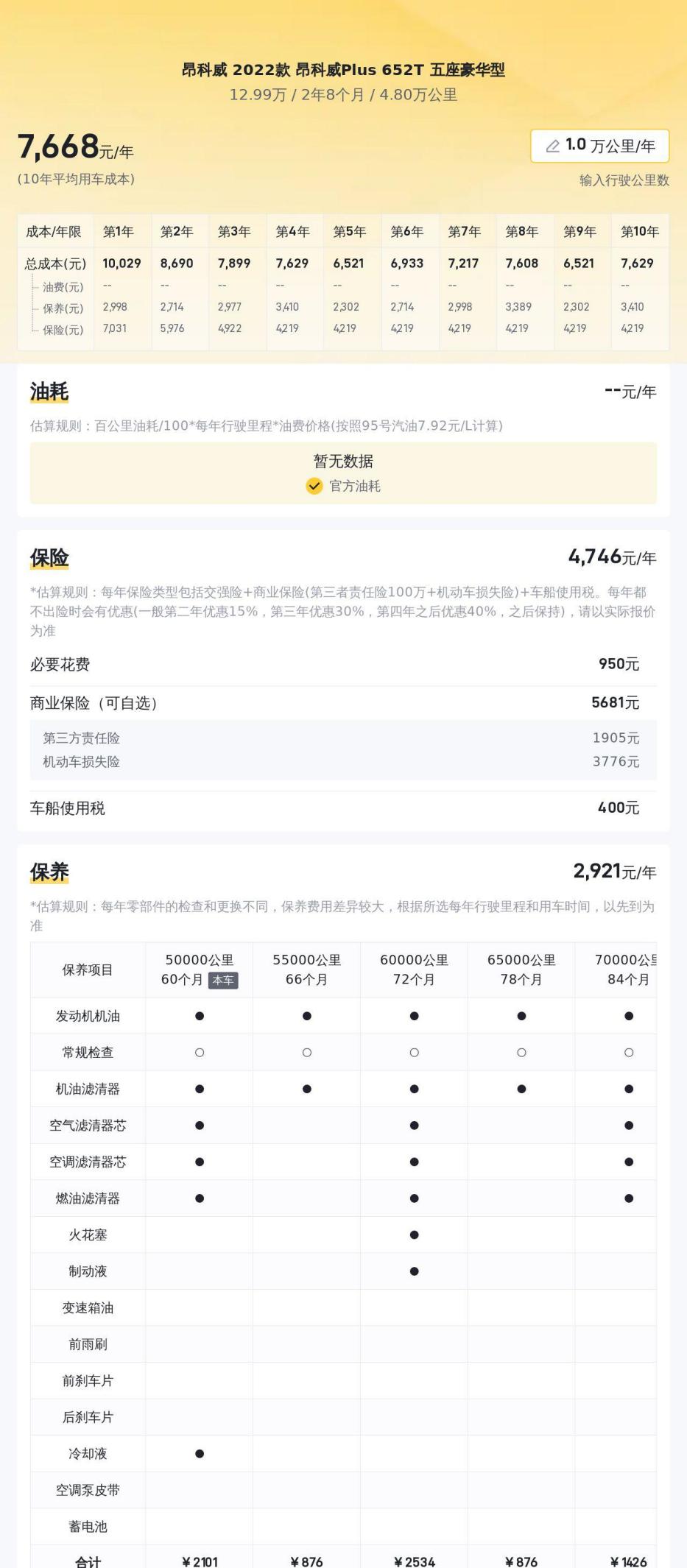 那么,昂科威Plus的用车成本如何呢?根据数据显示,这辆车的十年平均用车成本大约在每年1.2万元左右,其中包括油费、保养费、保险费等。以每年行驶2万公里计算,油费大约在5500元左右,保养费大约在2400元左右,保险费大约在4100元左右。这个用车成本在同级别车型中属于中等水平。