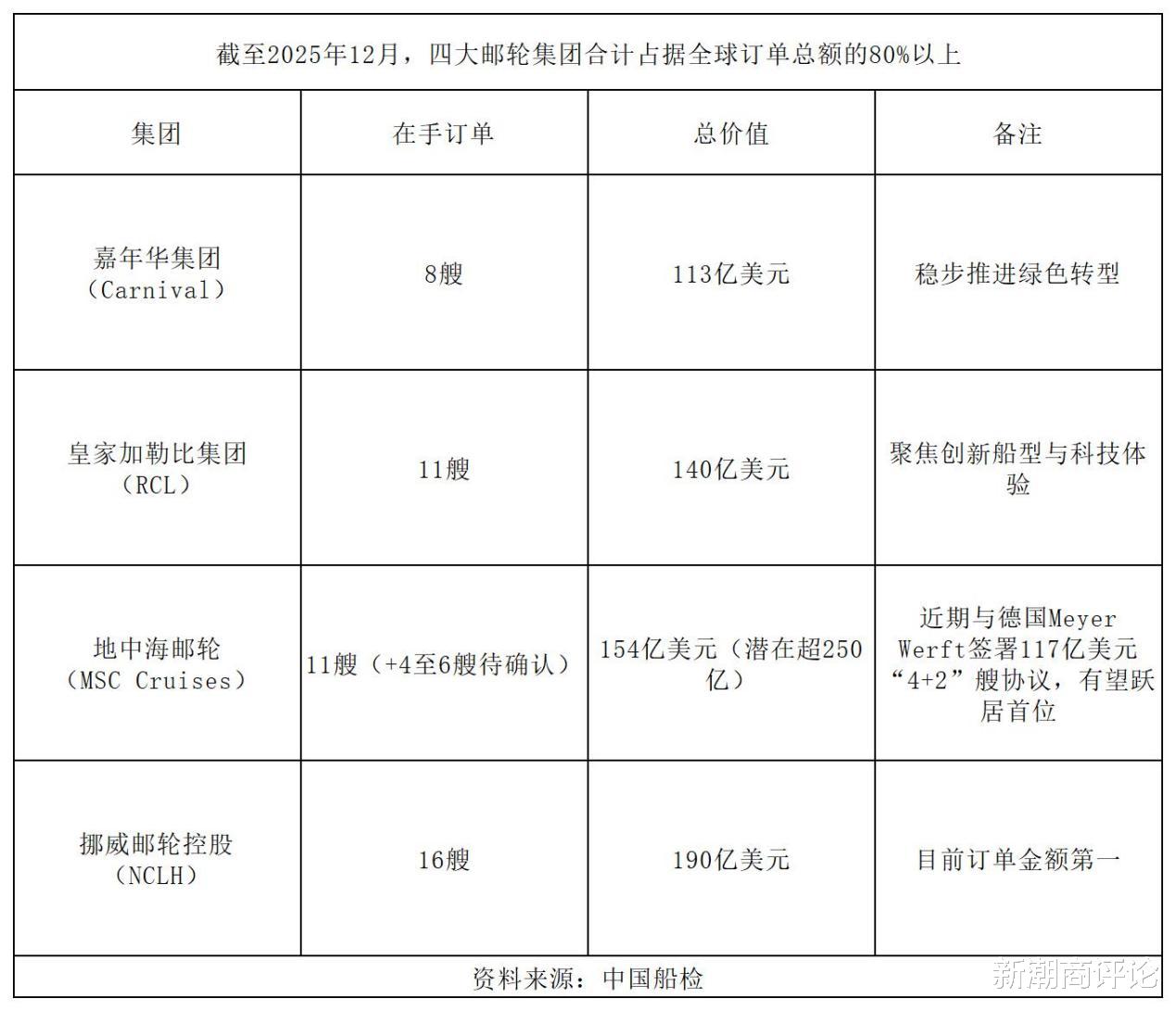 四大邮轮集团——嘉年华集团(Carnival Corporation & PLC)、皇家加勒比集团(Royal Caribbean Group)、地中海邮轮(MSC Cruises)、诺唯真邮轮控股(Norwegian Cruise Line Holdings)控制着79%的全球市场份额。
