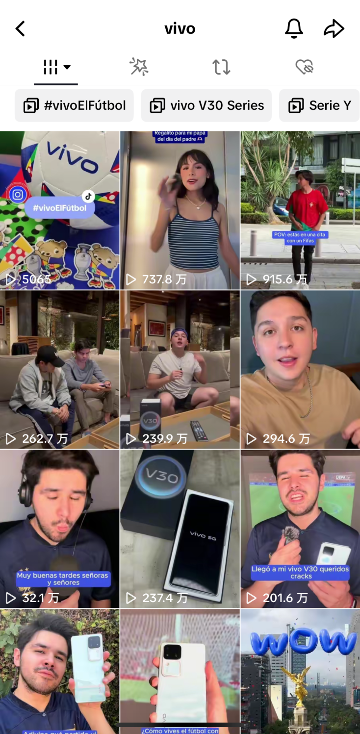 vivo在赛场上品牌露出,其TikTok账号在赛事期间坚持发布独家内容,展示其与赛事的紧密联系,吸引了大量球迷的关注,同时矩阵号开直播卖货。线上线下齐发力,传播—转化—完成购买。