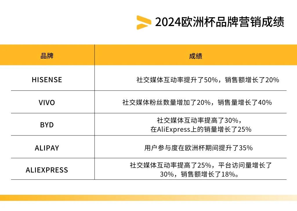 PART.01欧洲杯上的中国力量在全球化的今天,越来越多的中国品牌通过体育赛事这一平台实现国际化布局。欧洲杯官方显示,本届欧洲杯有13家“全球合作伙伴”级别的主赞助商,中国企业占据5位,分别为海信、比亚迪、Vivo、速卖通、支付宝,刷新了中国企业赞助该赛事的历史纪录。
