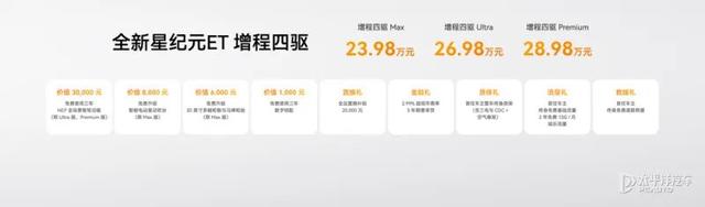 12月15日,星纪元ET增程四驱版正式上市,新车共推出三款车型,其官方指导价格为23.98-28.98万元。本次上新的车型卖点为雪豹四驱、黄金增程、猎鹰智驾3大硬核科技及8295芯片、电动遮阳帘、星动吧台等。