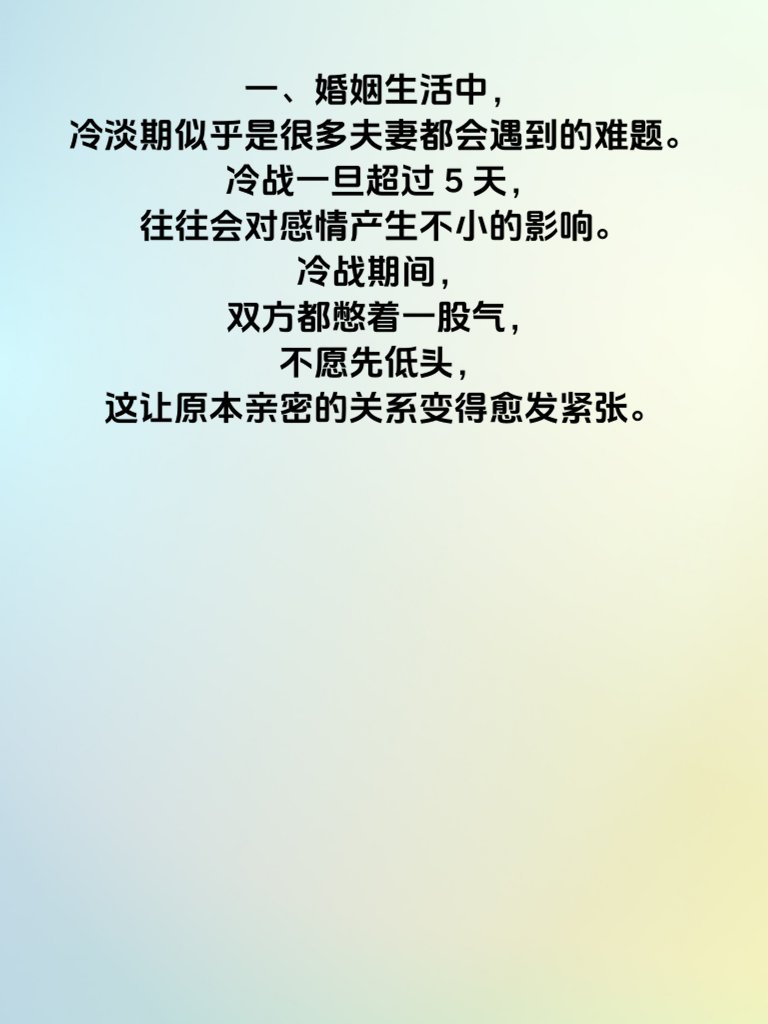 一、婚姻生活中,冷淡期似乎是很多夫妻都会遇到的难题。冷战一旦超过5天,往往会对感情产生不小的影响。冷战期间,双方都憋着一股气,不愿先低头,这让原本亲密的关系变得愈发紧张。 二、其实,想要打破婚姻冷淡的僵局,沟通是关键。不要总是等着对方来主动,自己也可以迈出第一步。找一个合适的时机,心平气和地和对方聊聊彼此的感受和想法。比如,你可以说:“最近我感觉我们之间好像有点冷淡,我心里不太舒服,你呢?”通过这样的方式,打开话匣子。 三、同时,回忆一下曾经的美好时光也能起到很好的作用。一起翻看过去的照片,聊聊那些甜蜜的瞬间,能让彼此重新感受到爱的温度。另外,适当制造一些小惊喜,也能为平淡的婚姻生活增添色彩。比如,为对方准备一份喜欢的小礼物,或者做一顿丰盛的晚餐,让对方知道你一直在乎着Ta。只要双方都愿意努力,婚姻一定能走出冷淡期,重新充满温暖与爱意。