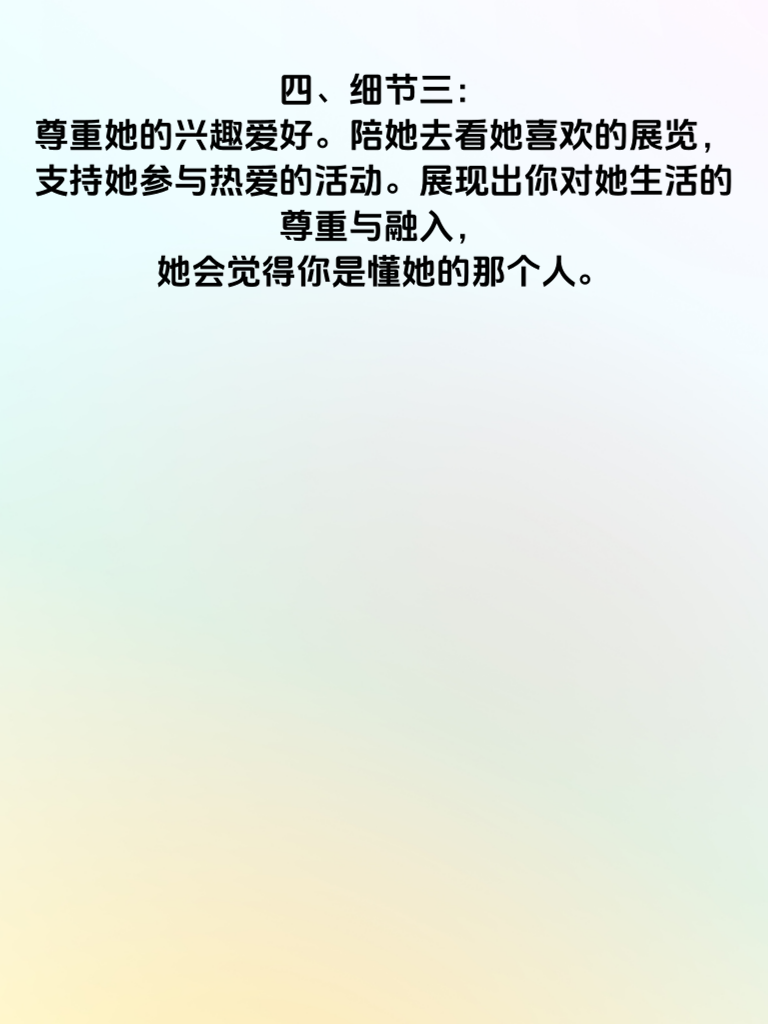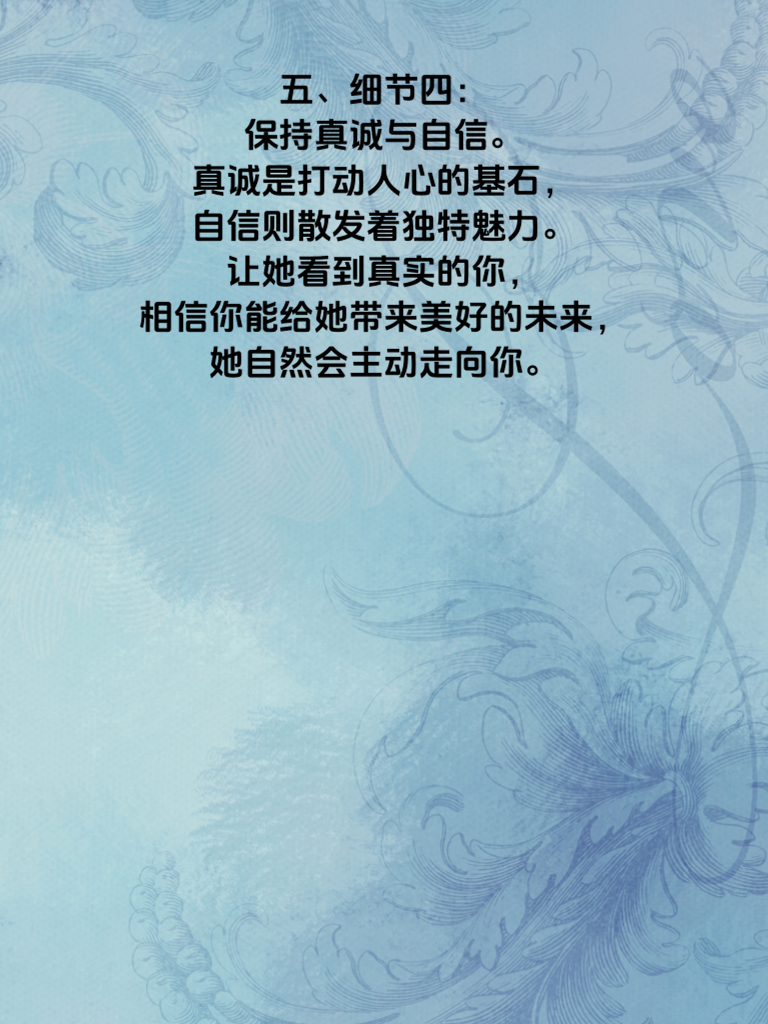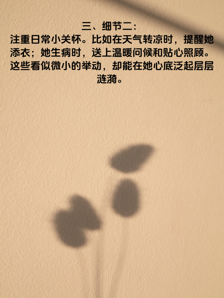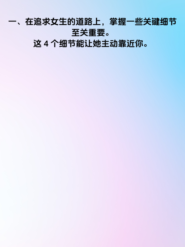 一、在追求女生的道路上,掌握一些关键细节至关重要。这4个细节能让她主动靠近你。 二、细节一:用心倾听她的话语。当她分享生活点滴、喜怒哀乐时,认真聆听,给予专注的眼神和适时的回应。让她感受到她在你心中的重要性,她会因此对你更有好感。 三、细节二:注重日常小关怀。比如在天气转凉时提醒她添衣,她生病时送上温暖问候和贴心照顾。这些看似微小的举动,却能在她心底泛起层层涟漪。 四、细节三:尊重她的兴趣爱好。陪她去看她喜欢的展览,支持她参与热爱的活动。展现出你对她生活的尊重与融入,她会觉得你是懂她的那个人。 五、细节四:保持真诚与自信。真诚是打动人心的基石,自信则散发着独特魅力。让她看到真实的你,相信你能给她带来美好的未来,她自然会主动走向你。