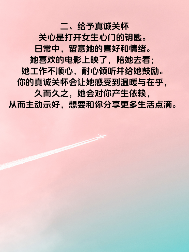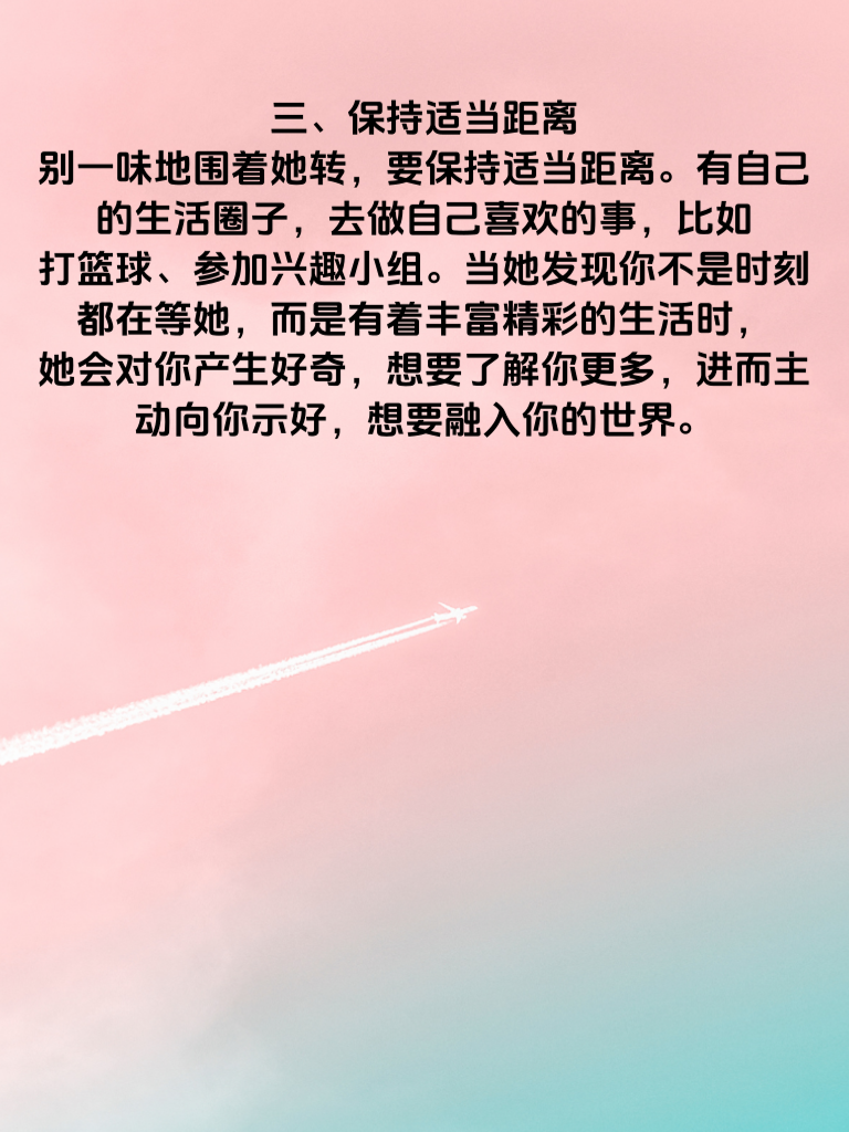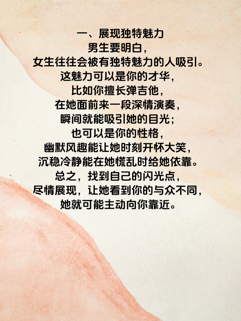 一、展现独特魅力,男生要明白,女生往往会被有独特魅力的人吸引。这魅力可以是你的才华,比如你擅长弹吉他,在她面前来一段深情演奏,瞬间就能吸引她的目光;也可以是你的性格,幽默风趣能让她时刻开怀大笑,沉稳冷静能在她慌乱时给她依靠。总之,找到自己的闪光点,尽情展现,让她看到你的与众不同,她就可能主动向你靠近。 二、给予真诚关怀,关心是打开女生心门的钥匙。日常中,留意她的喜好和情绪。她喜欢的电影上映了,陪她去看;她工作不顺心,耐心倾听并给她鼓励。你的真诚关怀会让她感受到温暖与在乎,久而久之,她会对你产生依赖,从而主动示好,想要和你分享更多生活点滴。 三、保持适当距离,别一味地围着她转,要保持适当距离。有自己的生活圈子,去做自己喜欢的事,比如打篮球、参加兴趣小组。当她发现你不是时刻都在等她,而是有着丰富精彩的生活时,她会对你产生好奇,想要了解你更多,进而主动向你示好,想要融入你的世界。