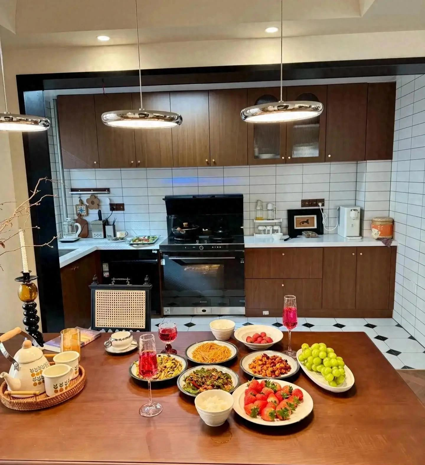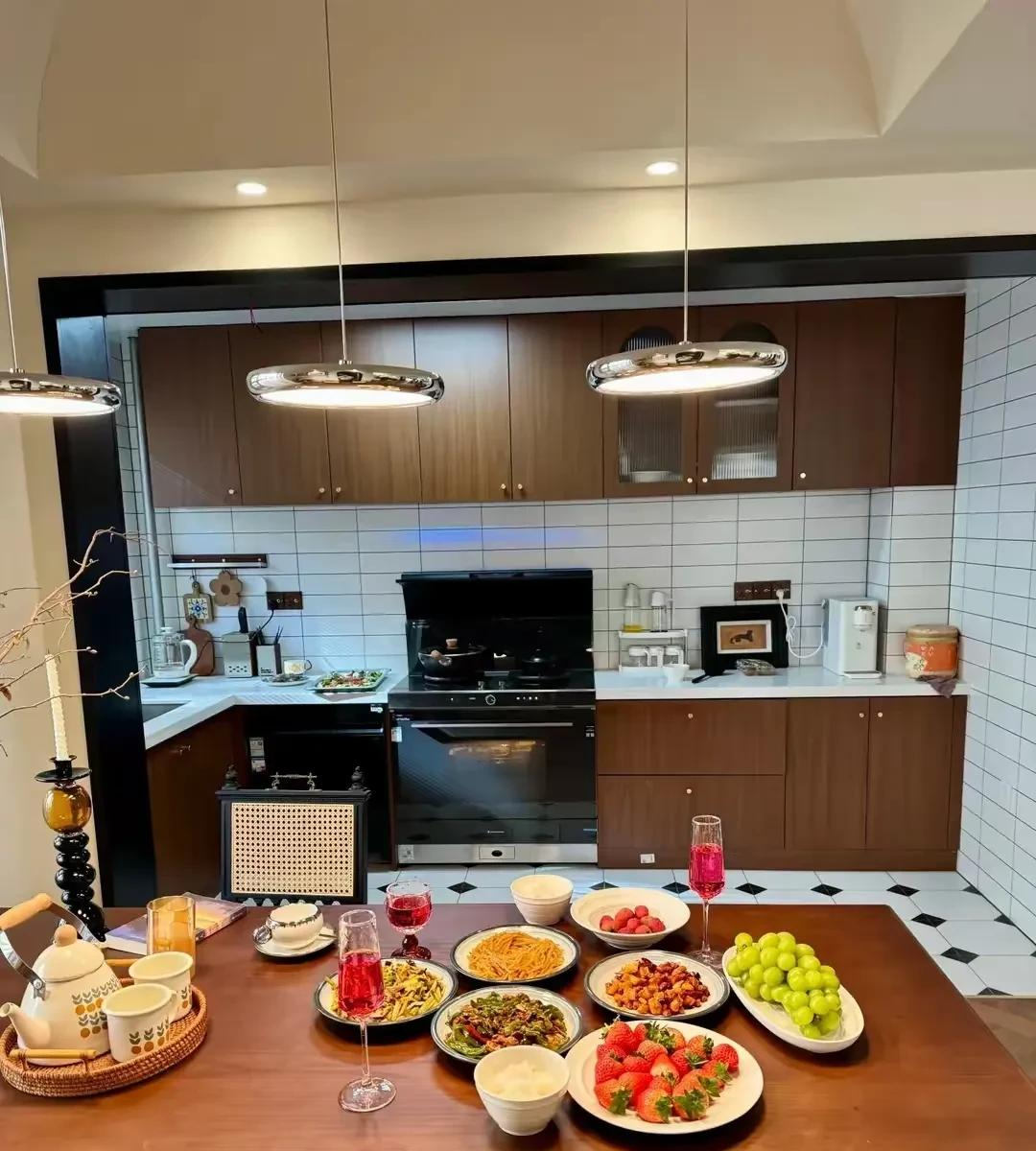 餐桌上方挂着一盏造型独特的吊灯,在灯光照耀下,营造出温馨舒适的用餐氛围。
