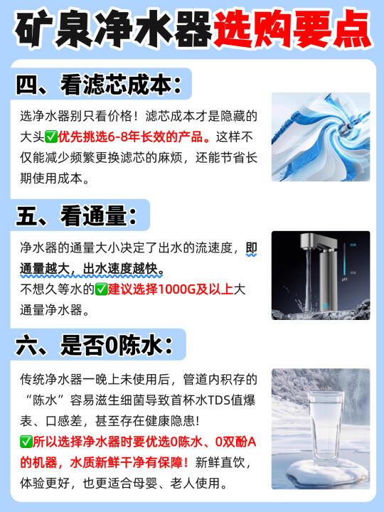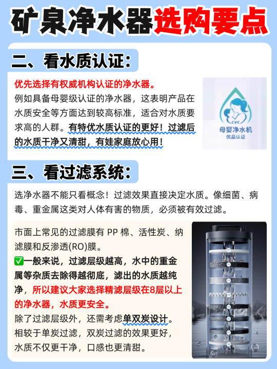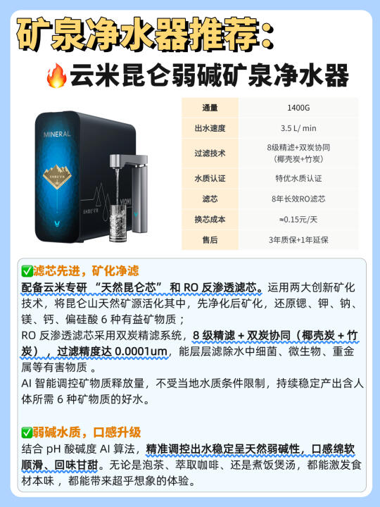 回想起曾经在出租房用水,不仅水质硬,余氯超标,还带着浓烈的消毒水味道,以至于我以后搬家,净水器都成为我的家居必备电器。 至于矿泉水净水器到底有没有必要⁉️我的回答是很有必要! 矿物质水💧可以保留水中人体所需的大部分矿物质和有益元素,在别的一些用水场景上的优先级也是要高于纯净水的。尤其是对于👉🏻家里有孩子、老人的家庭~ - 🤷‍♀️那一台性价比高的矿泉净水器怎么选呢 ✅选矿泉纯净水 矿化技术、矿物质含量、酸碱度等都是选购关键 ✅看水质认证: 优先选择有权威机构认证的净水器。有娃家庭放心用! ✅看过滤系统: 建议大家选择精滤层级在8层以上的净水器,双炭过滤的效果更好,水质不仅更干净,口感也更清甜。 ✅看滤芯成本: 优先挑选6-8年长效的产品。这样不仅能减少频繁更换滤芯的麻烦,还能节省长期使用成本。 ✅看通量: 不想久等水的,建议选择1000G及以上大通量净水器。 ✅是否0陈水: 选择净水器时要优选0陈水、0双酚A的机器,水质新鲜干净有保障! ✅看龙头和智能化程度: 选有AI智能触屏龙头的+手机连接APP,TDS值水质检测实时汇报,使用操作起来更方便 ✅加分项: ✔️细窄机身不占地,节省厨下空间,小户型局促厨下也能轻松收纳 ✔️选择有口碑、有保障的品牌,售后有保障,用水更安心 - 懒人抄作业——🔥云米昆仑弱碱矿泉净水器 配备云米专研 “天然昆仑芯” 和 RO 反渗透滤芯。 💡8 级精滤 + 双炭协同(椰壳炭 + 竹炭),过滤精度达 0.0001um 精准调控出水 pH 值稳定呈天然弱碱性 💦口感绵软顺滑、回味甘甜 8 年长效 RO 滤芯,长久使用无需频繁更换滤芯,每天成本仅约 💰0.15元 ➕搭载AI大屏龙头,水质、酸碱度、矿物质元素实时动态显示,使用更方便 1400G大通量,2秒接满一杯水,20秒接满一锅水,做饭效率都变快了 云米作为美国上市公司,多年深耕净水器领域,拥有投资 10 亿打造的 “净水超级工厂” ,品牌实力雄厚,品质与售后皆有保障 ,大家都能放心用! -