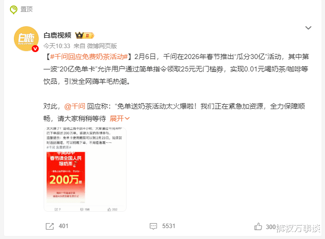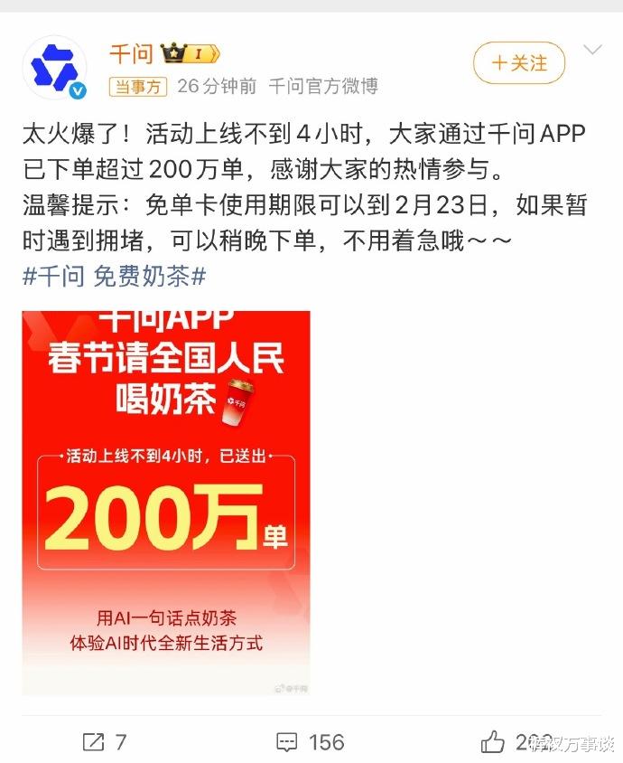 结果大家都知道了,大神家的门被挤得快变形了。千问的回应带着点委屈的憨厚:“太火爆啦,正忙着扛柱子撑门呢,大家稍等啊。”然后又补了一句,“才四个小时,门缝里已经递出去两百万杯了。”这话里,我咋听出了一丝骄傲呢?