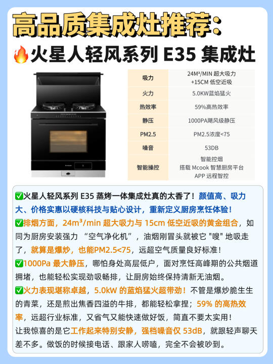 🔍轻风系列 E35 蒸烤一体集成灶是火星人(年度亿级单品),是集成灶界的黑马,颜值高、吸力大、价格实惠,备受年轻消费者喜爱。