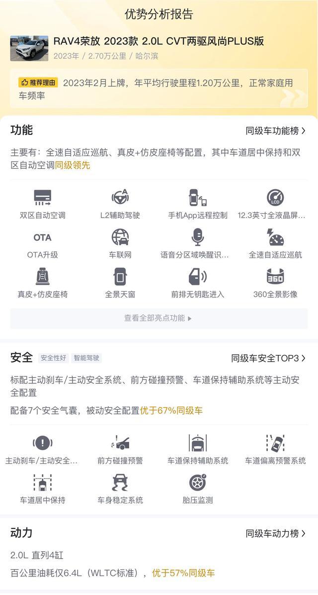 对于二手车市场的整体行情,我们必须理性分析。当前这辆2023款RAV4荣放在二手市场的价格为13.6万元,结合其车况、行驶里程及维护记录,这一价格在市场中显得相当有竞争力。对于消费者而言,关注的不仅仅是价格,更是这辆车所能提供的使用价值与未来的保值率。在二手车的交易中,如何评估车辆的真正价值显得尤为重要。
