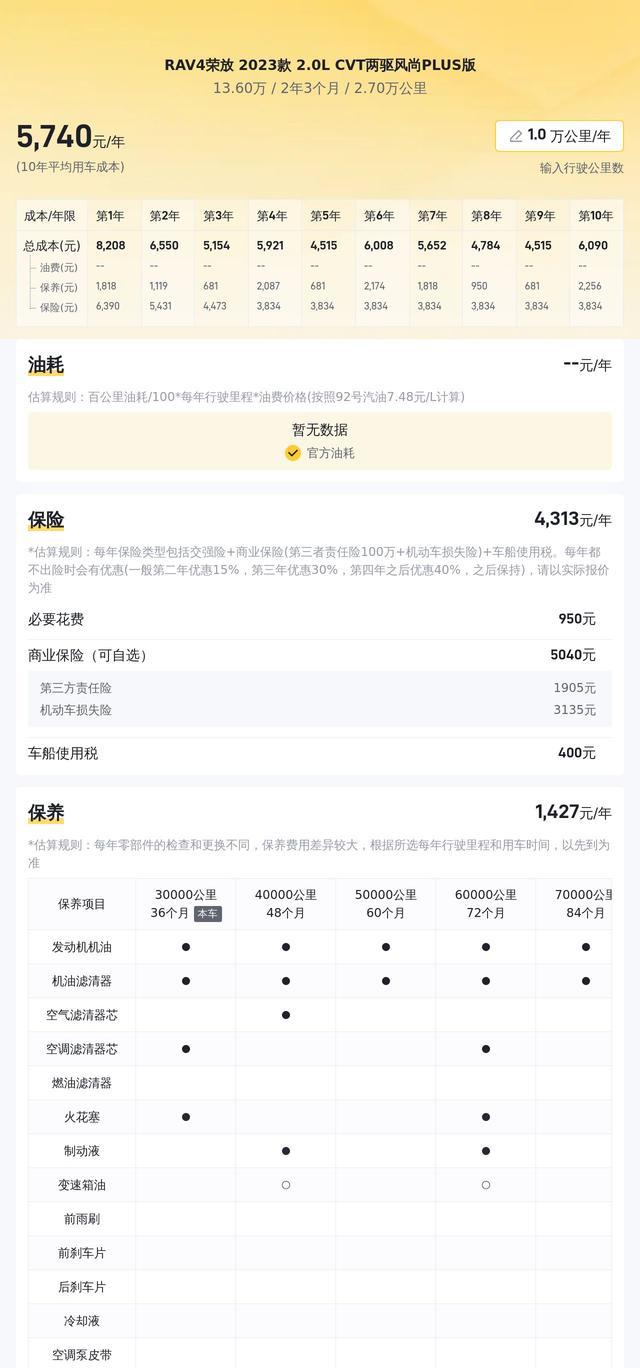 我们还需关注到,选择购车不仅要喜欢这款车,更需要考虑养车的综合成本。在对2023款RAV4荣放的深入分析中,我们可以看到,除了购车成本外,保险、保养、油耗等因素都将直接影响到未来的用车体验。在保险方面,车辆的类型、使用性质都会影响保费,而日常的保养和维修也需要提前考虑。根据市场数据,家庭用车每年的养车成本大约在1万到1.5万之间,而RAV4荣放由于其良品质和稳定的性能,通常在这方面的支出相对较少。
