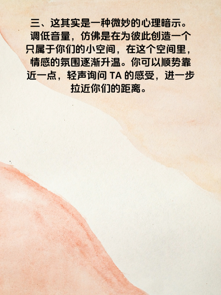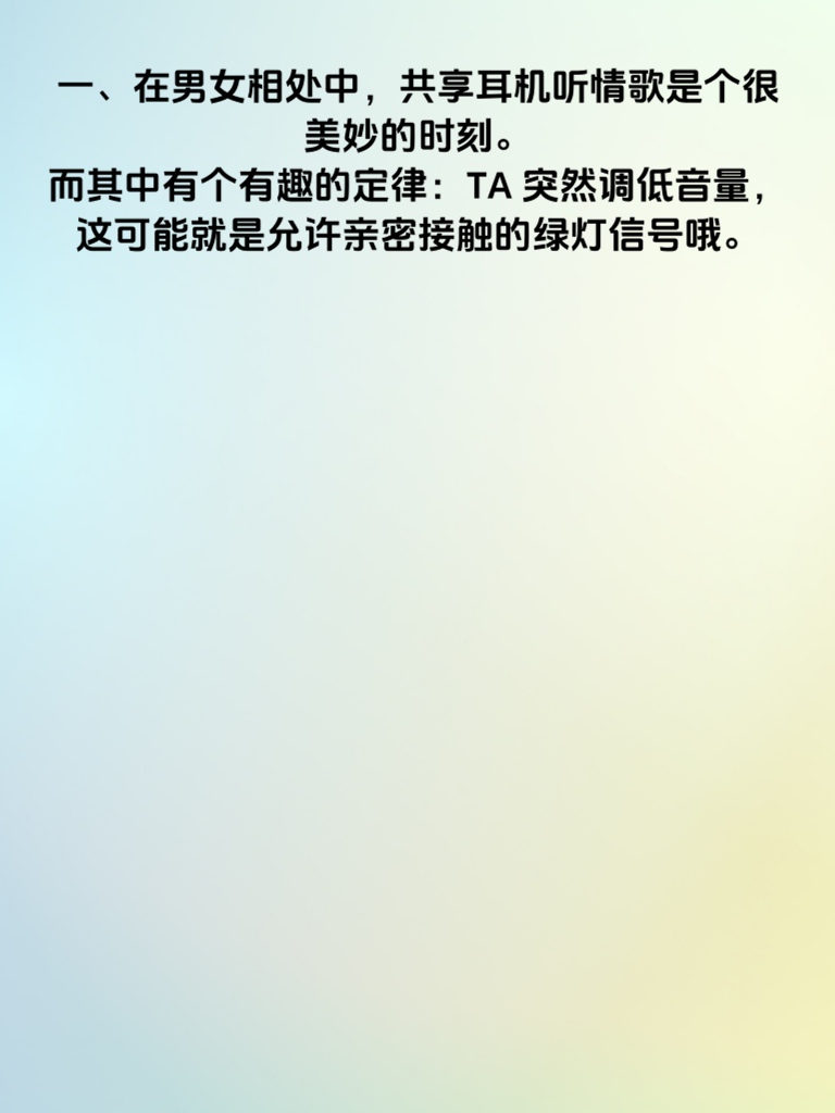 一、在男女相处中,共享耳机听情歌是个很美妙的时刻。而其中有个有趣的定律:TA突然调低音量,这可能就是允许亲密接触的绿灯信号哦。 二、当一起戴着耳机沉浸在音乐世界里时,如果对方突然调低音量,也许是TA内心有了别样的情绪波动。这时候,很有可能是TA希望能和你有更近距离的交流,比如一个温柔的眼神交汇,一次轻轻的触碰。 三、这其实是一种微妙的心理暗示。调低音量,仿佛是在为彼此创造一个只属于你们的小空间,在这个空间里,情感的氛围逐渐升温。你可以顺势靠近一点,轻声询问TA的感受,进一步拉近你们的距离。 四、但要注意哦,这种时候的亲密接触一定要适度且自然。不要过于急切或鲁莽,尊重对方的反应。如果对方也有积极的回应,那么一段美好的情感互动或许就此展开啦。把握好这个共享耳机听情歌的定律,说不定能让你们的关系更上一层楼呢。