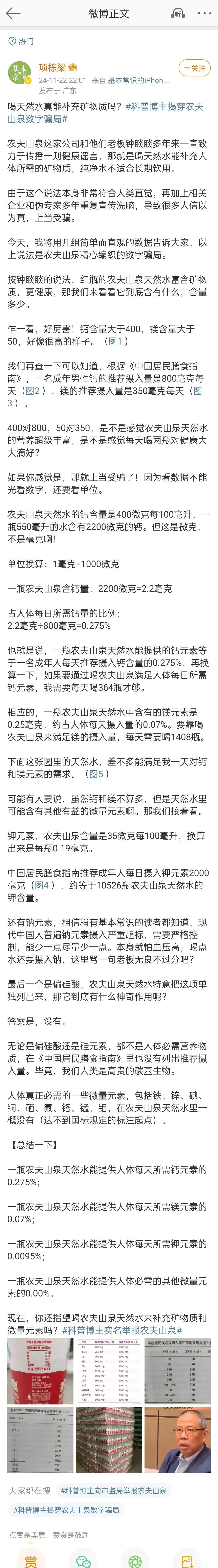 该科普博主还在微博中表示,农夫山泉所宣传的“喝天然水能补充人体所需的矿物质,纯净水不适合长期饮用”是健康谣言。并运用数据进行了例证。