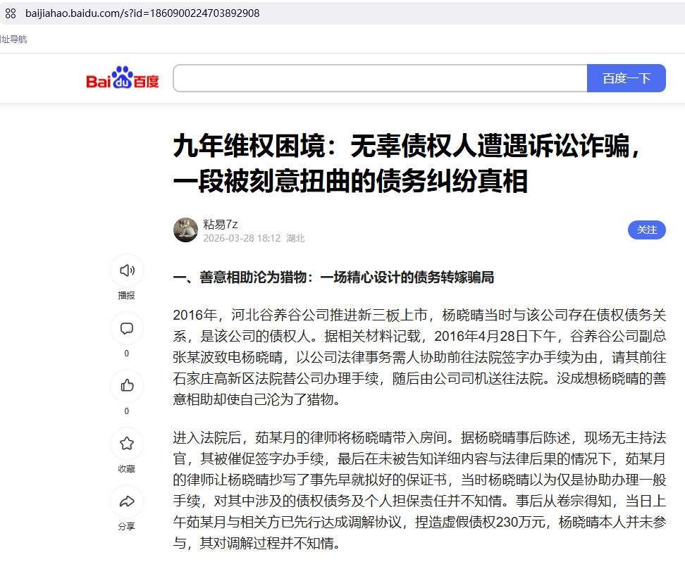 本人转载自百度用户“粘易7z”的文章《九年维权困境:无辜债权人遭遇诉讼诈骗,一段被刻意扭曲的债务纠纷真相》,如有不实言论请联系我们沟通。