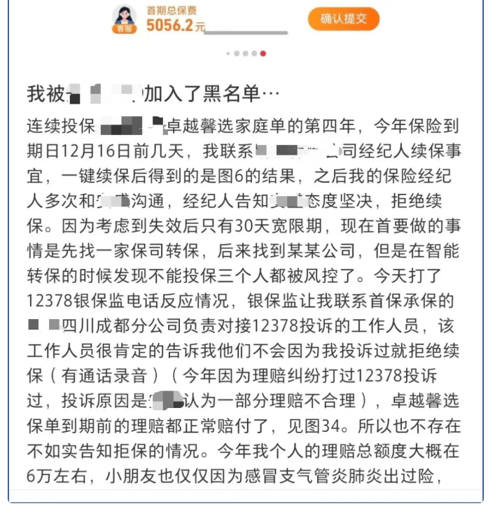 一名男子连续4年投保某保险公司的家庭中端医疗险,今年住院5天,直接点了48顿VIP套餐,要求保险公司全额报销。保险公司拒绝后,男子闹到银保监会,保险公司最终赔了钱,可等到男子续保的时候,却直接被拒了。更离谱的是,他们一家三口想换别家保险公司投保,也被风控拦了下来。