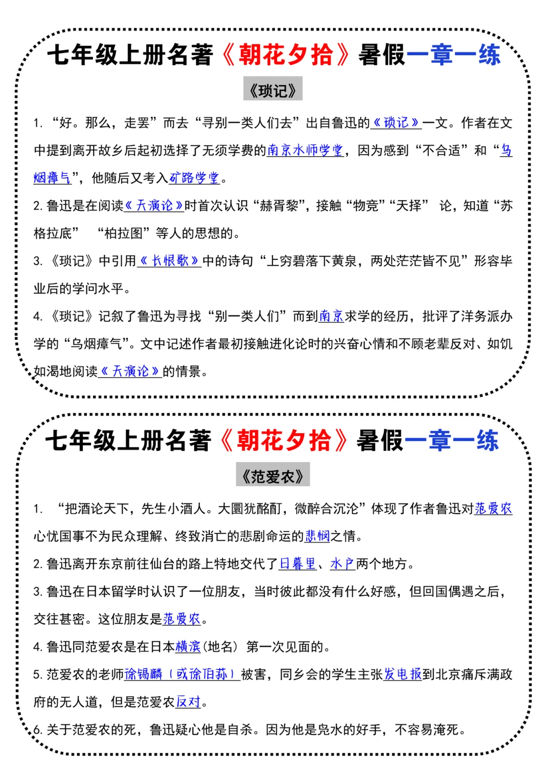 七上名著《朝花夕拾》暑假早背晚默小纸条