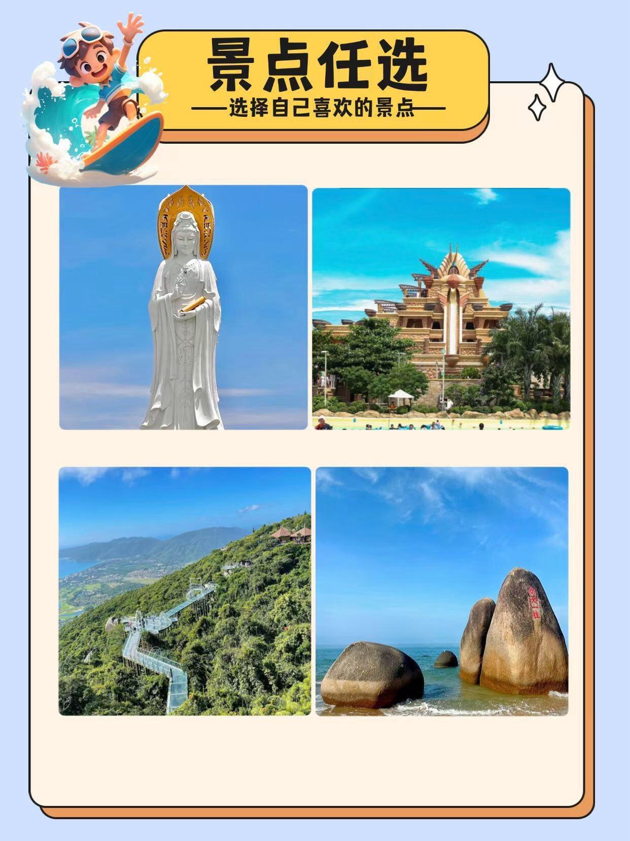 想去的景点随便挑:南海观音的庄严、蜈支洲岛的清澈、西岛的文艺、森林公园的绿意……想在海边发呆一整天?没问题!想早起追