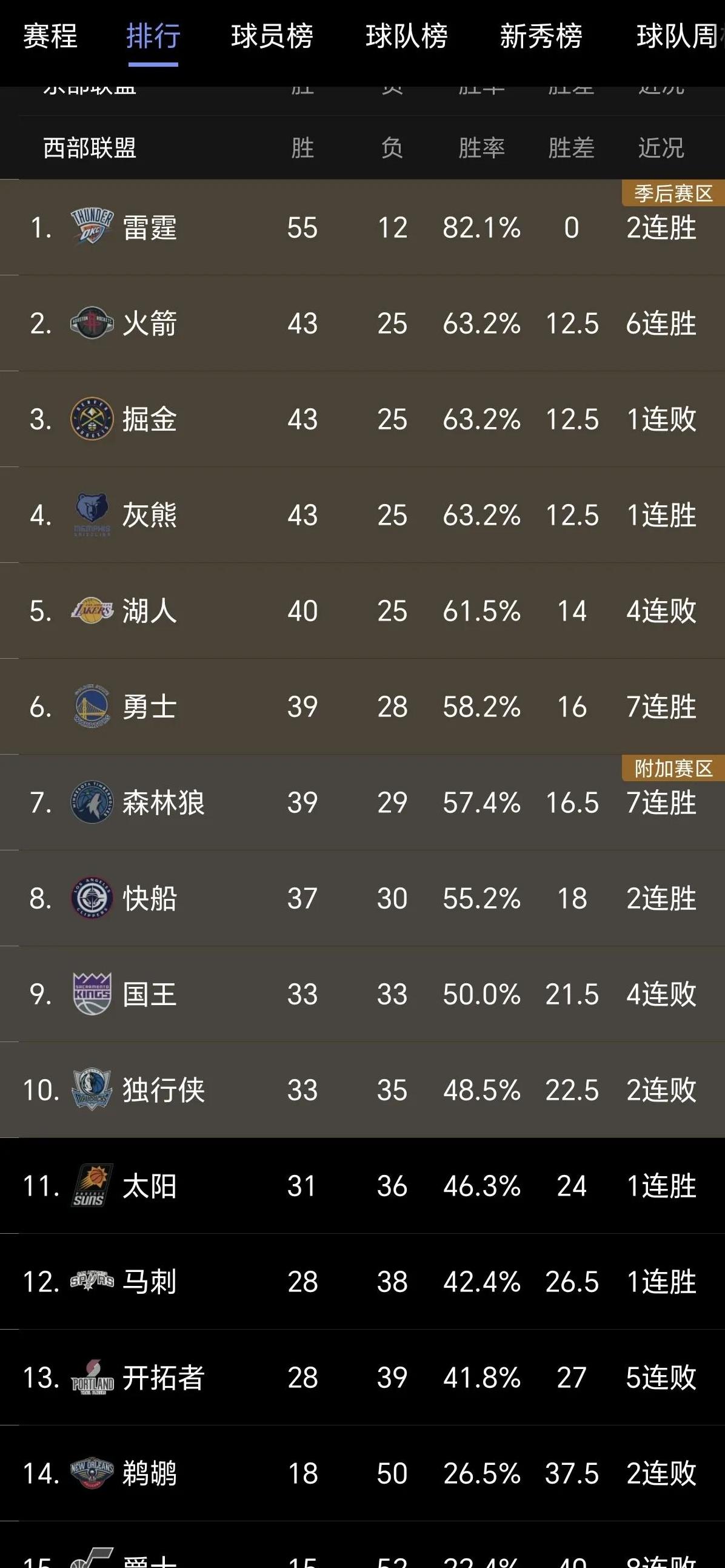勇士的连胜不仅提升了球队士气,也让他们的战绩来到了39胜28负,位列西部第6,仅落后第5的湖人两个胜场。