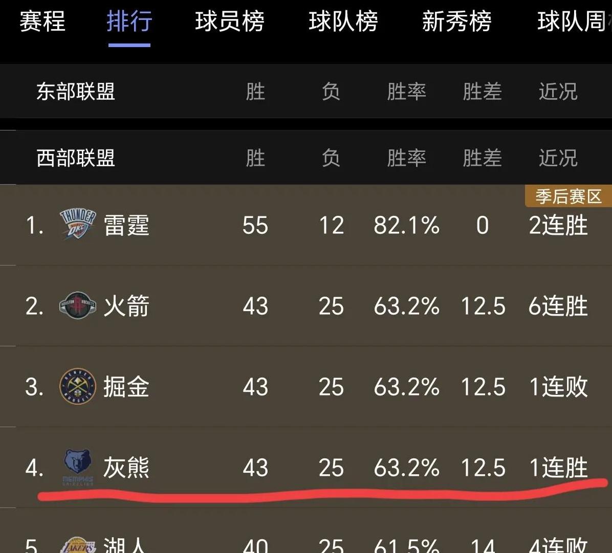 这场大胜让灰熊的战绩追平了火箭和掘金,同为43胜25负,暂列西部第4。