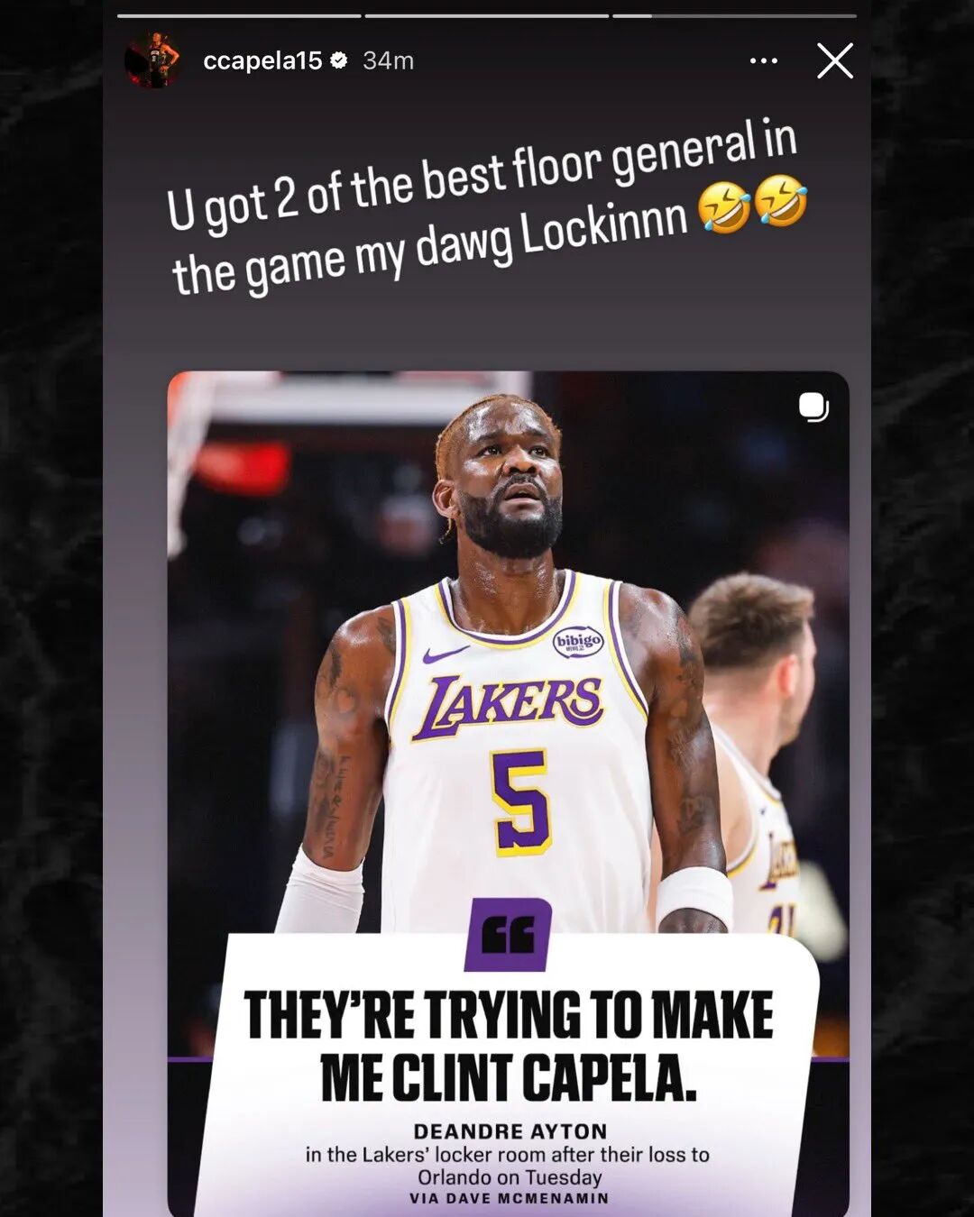 事情是这样,此前湖人主场不敌魔术之后,湖人跟队记者Dave McMenamin撰文写道,艾顿在结束采访后,一边走向淋浴间一边说道:"他们想把我变成克林特卡佩拉,但我可不是卡佩拉。”