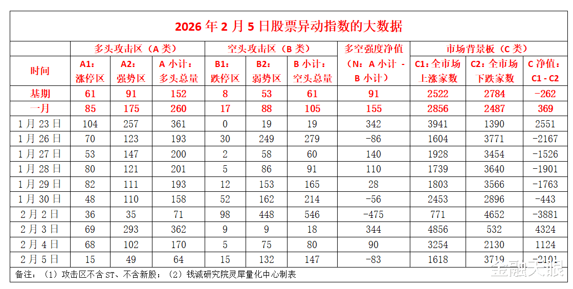 2026年2月5日,A股市场在缩量调整的大环境下,指数普遍下跌,个股跌多涨少。不过,市场内部结构分化显著,股票异动指数系统显示,多头动能大幅收缩,但局部消费主线却逆势活跃,凸显出资金在谨慎氛围中的结构性布局。
