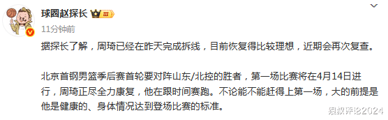 北京时间4月8日,根据媒体人赵探长发文:周琦已经在昨天完成拆线,目前恢复得比较理想,近期会再次复查。
