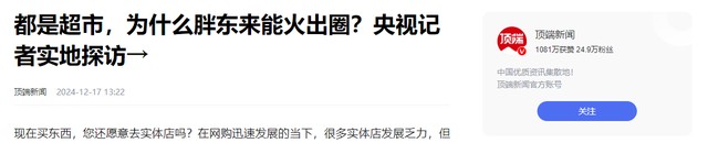 顶端新闻:2024年12月17日,《都是超市,为什么胖东来能火出圈?央视记者实地探访→》