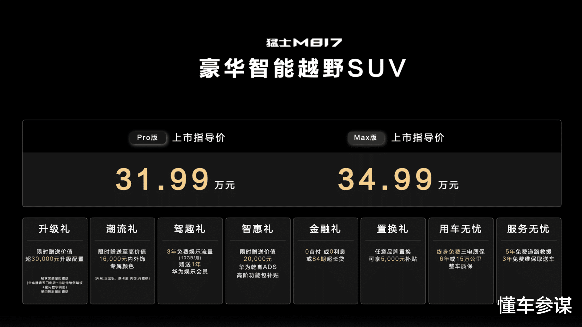 此次上市的猛士M817共有两个版本:Pro版指导价31.99万元,Max版指导价34.99万元。值得一提的是,凡从即日起至9月30日下订的用户,可享至高价值超7万元的8重首销专属权益,包括3年免费娱乐流量、0首付/0利息金融方案、任意品牌置换5000元补贴、终身免费三电质保等,可谓“诚意拉满”。