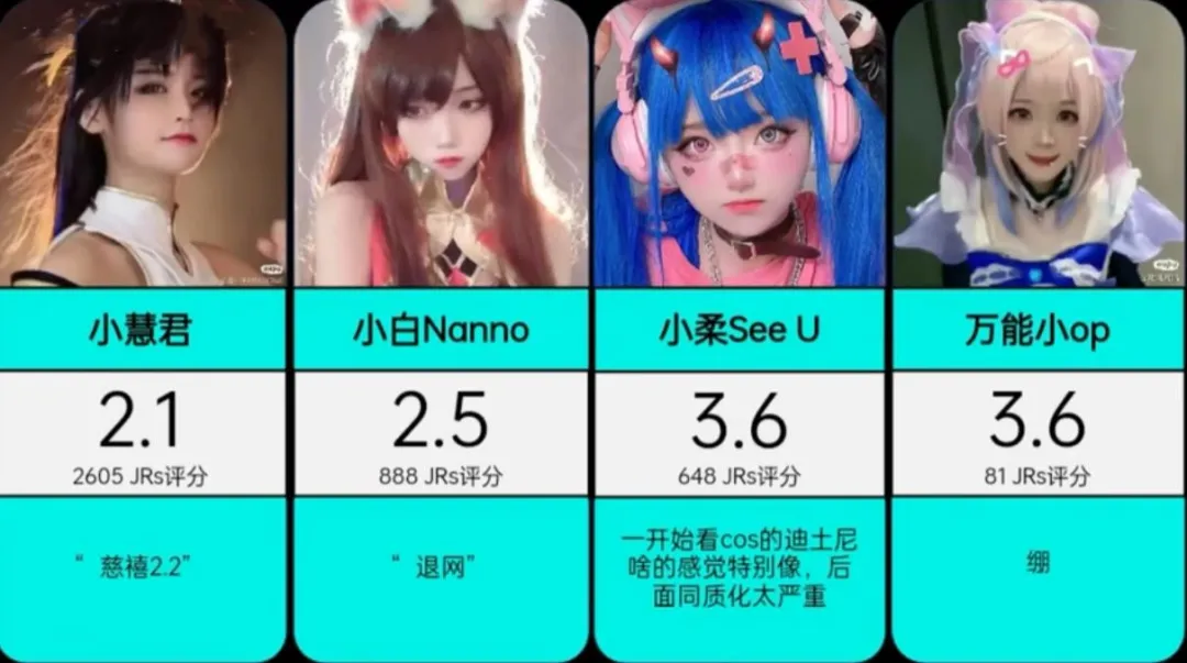 细品会发现她们的颜值也不算低,其中最低的乃是小慧君,曾经也是辉煌过的COSER,可惜却因造谣被人民网公开批评,为解约竟陷害老板太心机了。