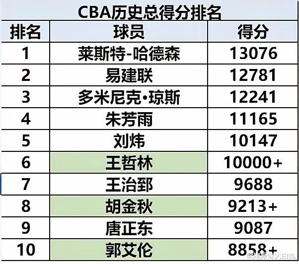 值得一提的是CBA历史得分榜,超过一万分的只有王哲林和琼斯没有总冠军,两位也是现役的球员,琼斯想拿冠军基本没有什么可能了,但是王哲林还有希望。另外接近10000分球员,眼下只有胡金秋有希望拿到10000分,郭艾伦基本没什么希望了,毕竟差了将近1200分,郭艾伦现在打的比赛也很少了。另外易建联是真的可惜了,要不是广东男篮买了周琦一年使用权,他就能再打一个赛季,场均7-8分就能历史第一。