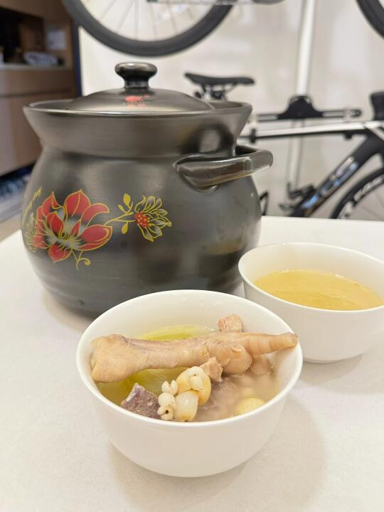 [一R]猪骨鸡爪焯水,淮山节瓜削皮切大段,莲子薏米陈皮提前浸泡20分钟