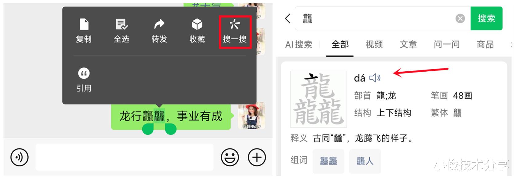 好友发来一段唯美的文案,想转发,却发现有几个生僻字不认识,也不懂是什么意思,此时,我们长按这段文案,选中不认识的字,点击搜一搜,就能快速识别了!