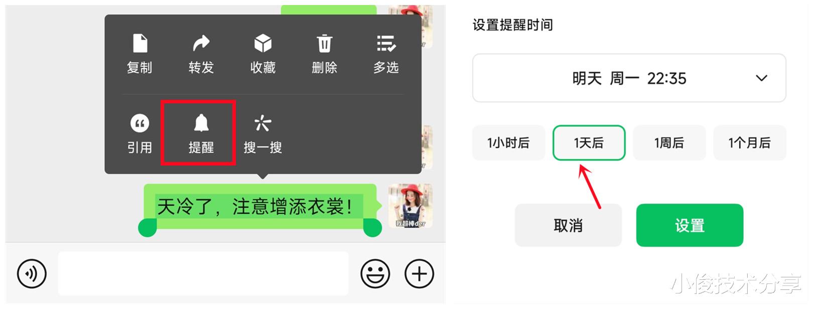 此时,长按这条问候2秒,选择【提醒】,按要求设置好时间,然后再把它置顶聊天,这样只要打开微信就能一眼看到,再也不用担心忘记重要事情了